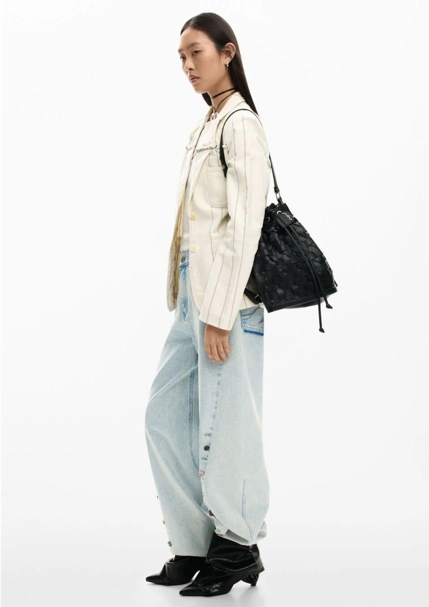Borsa media di design con stampa in colore nero e struttura a sacco. Un unico manico lungo per portarla a spalla e chiusura con cordoncino regolabile. Materiale esterno in poliuretano riciclato con dettagli visibili di patch. Dimensioni: 39x17x32 cm