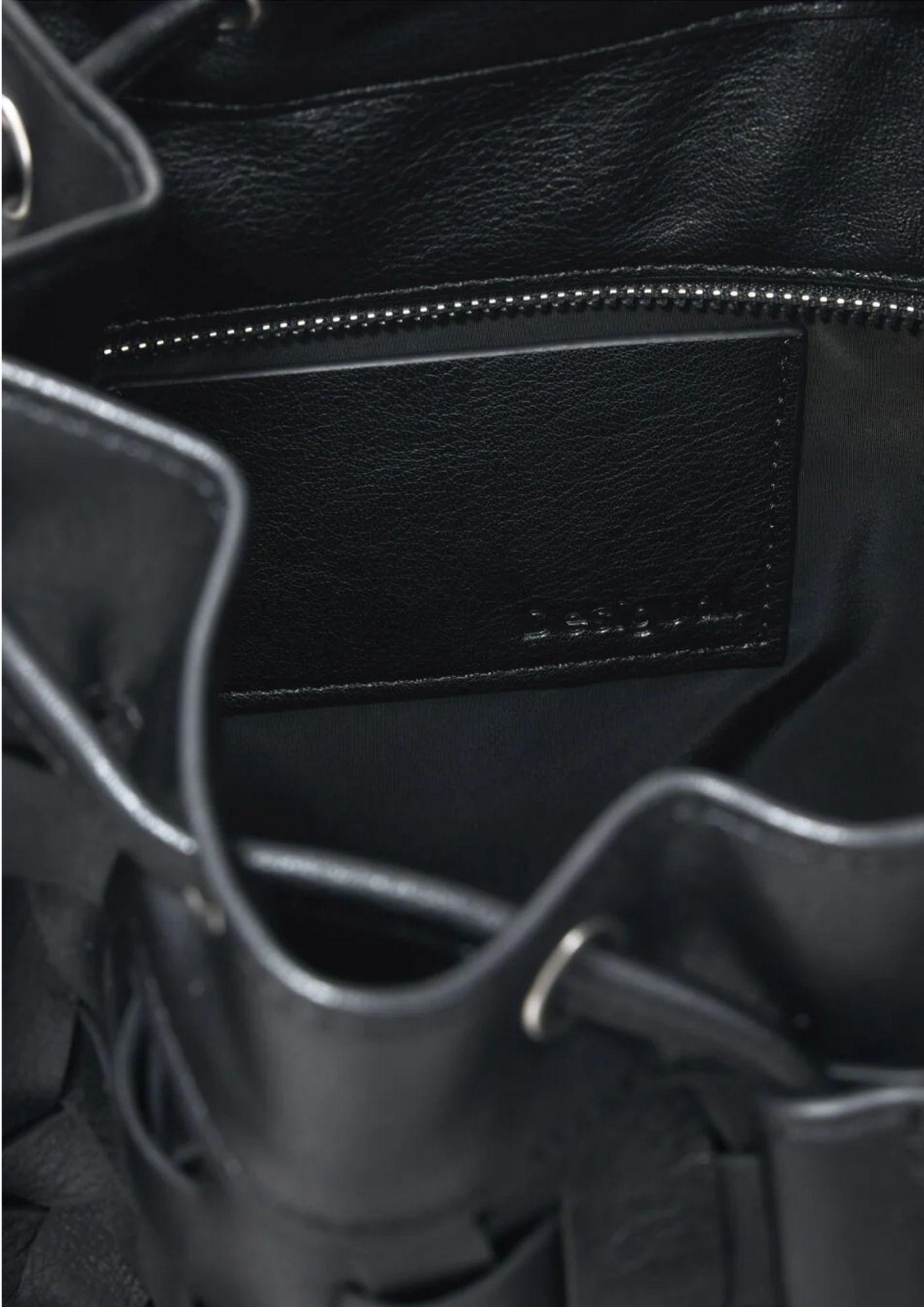 Tessuto: poliuretano riciclato Stampa in tonalità scura con effetto patch Unico manico lungo Chiusura: cordoncino regolabile Struttura tipo sacco Design con patch decorativi. Composizione esterna: 100% Poliuretano. Composizione interna: 100% Poliestere