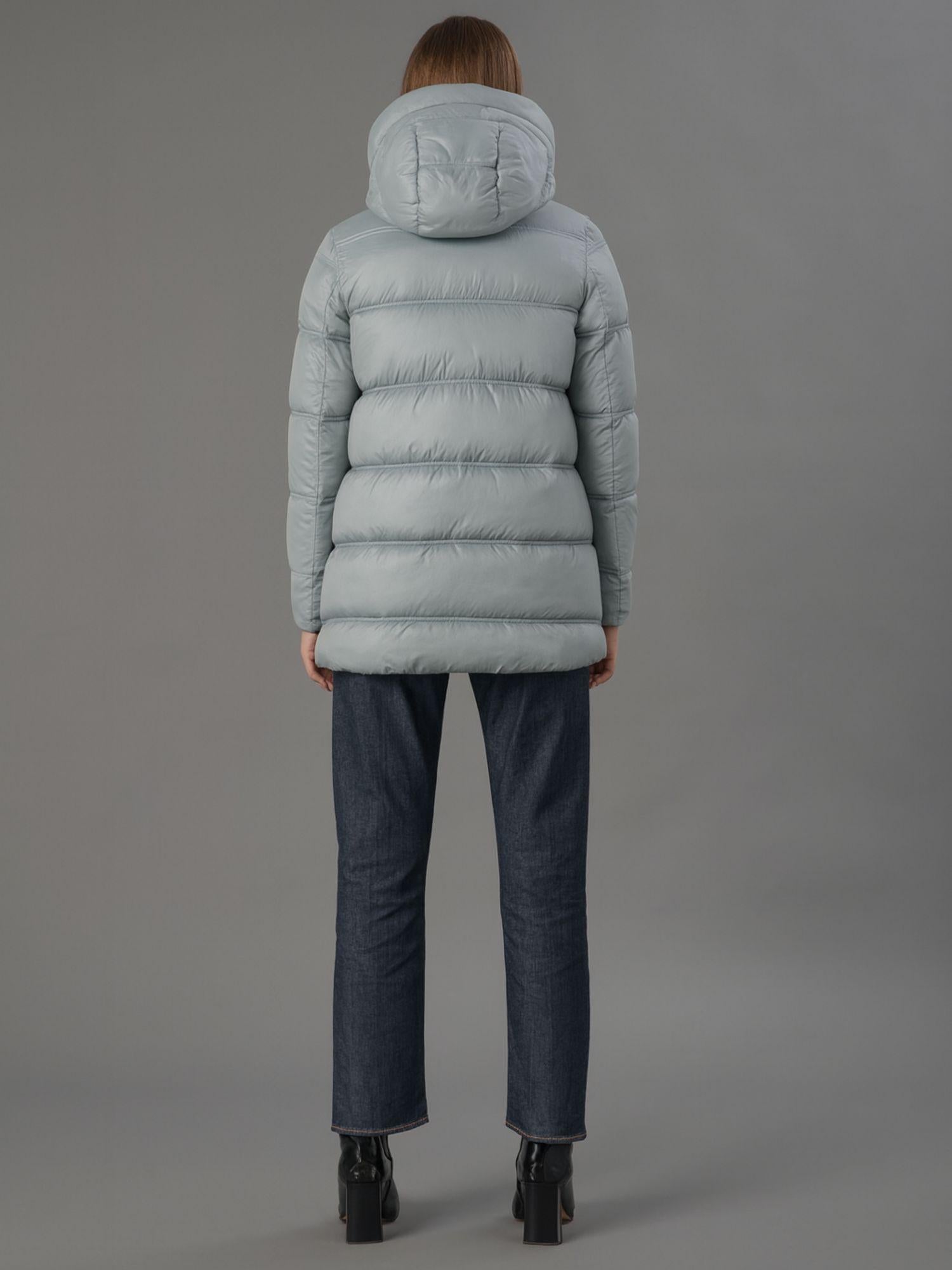 Capospalla imbottito realizzato in nylon leggero con trama nera dalleffetto cangiante, ideale per un look moderno e funzionale. Il cappuccio avvolgente con doppio orlo offre protezione e stile, mentre le tasche laterali a doppio filetto imbottito con zip e le aperture laterali con zip aggiungono praticità e carattere. La trapuntatura a doppio ago e limbottitura media garantiscono calore e comfort, mentre la linea svasata di media lunghezza assicura una vestibilità femminile e regolare. Tessuto: 100% nylon.