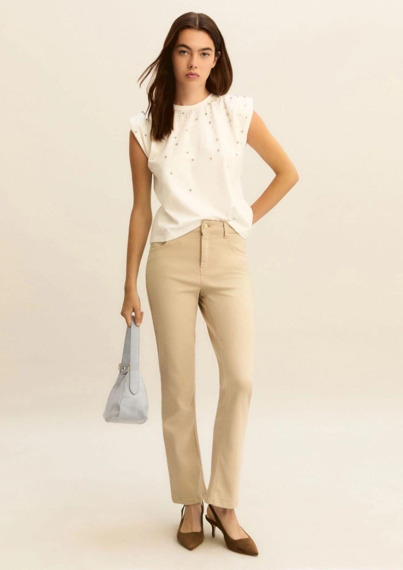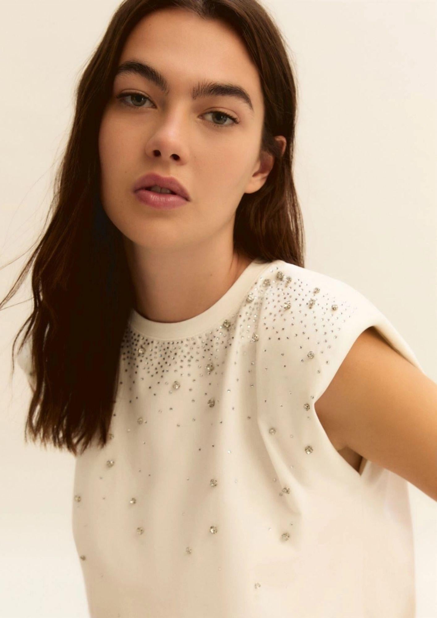 Impossibile non amare la t-shirt in morbido cotone stretch, con le sue linee essenziali, le spalle leggermente imbottite per un taglio deciso e una pioggia di cristalli ricamati sul davanti. T-shirt in jersey di cotone stretch. Fit regolare Scollo stondato
