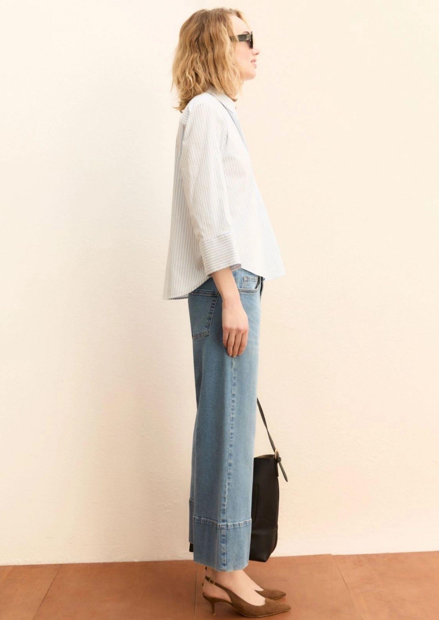Fondo stondato con spacchi laterali. 75% cotone, 22% poliammide, 3% elastan.