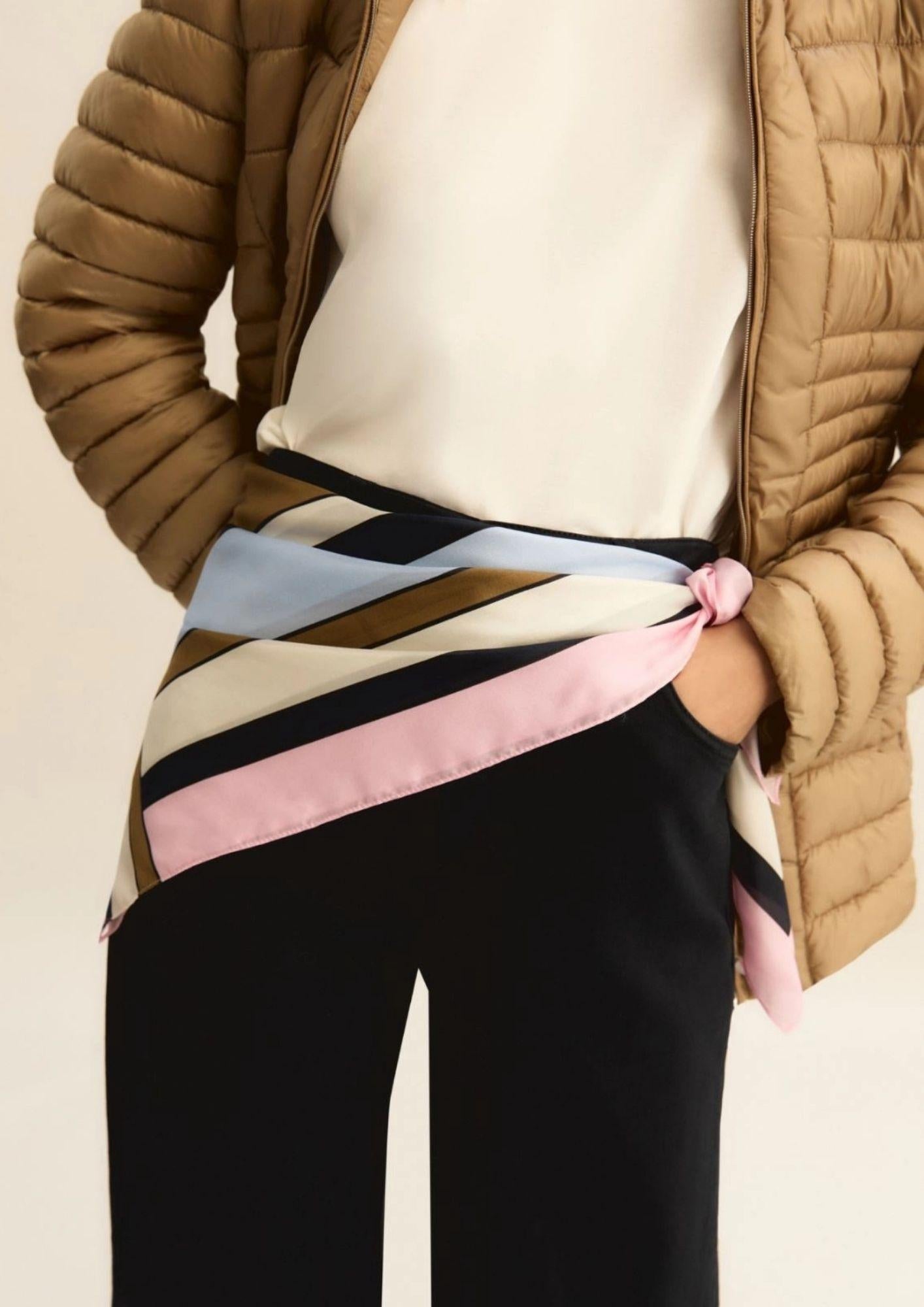 L'eleganza, in formato quadrato: nuovo foulard in morbido twill, con fantasia colorata che introduce la leggerezza della nuova stagione. Da annodare al collo, tra i capelli, alla borsa o al polso. Foulard in twill stampato Motivo fantasia Dimensioni: 90 x 90 cm. Tessuto: 100% Seta