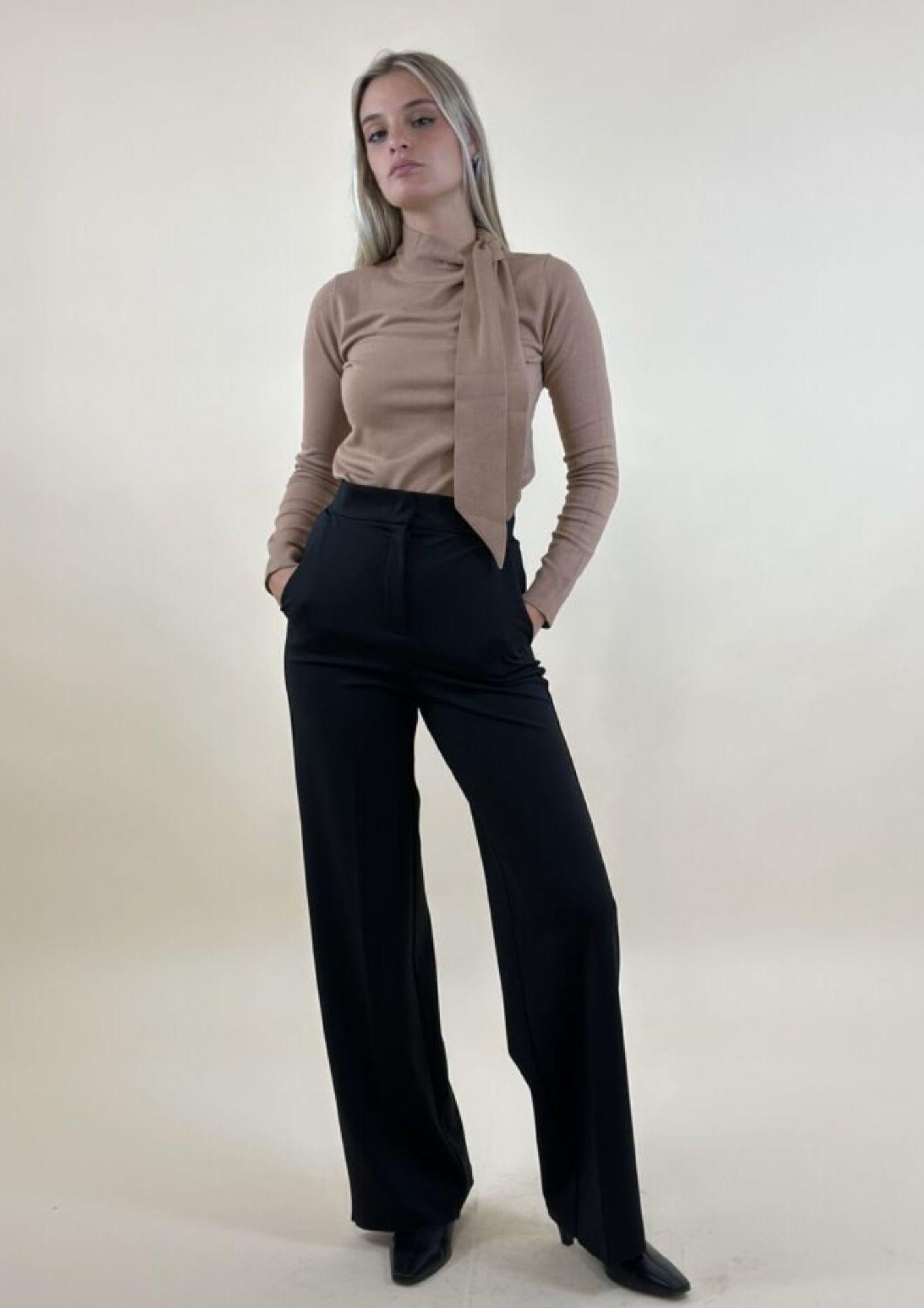 Maglia in filato di viscosa stretch. Fit aderente. Scollo stondato con sciarpa unita, polsi e fondo capo con costine. Filato in maglia: 70% Viscosa, 30% Poliammide.