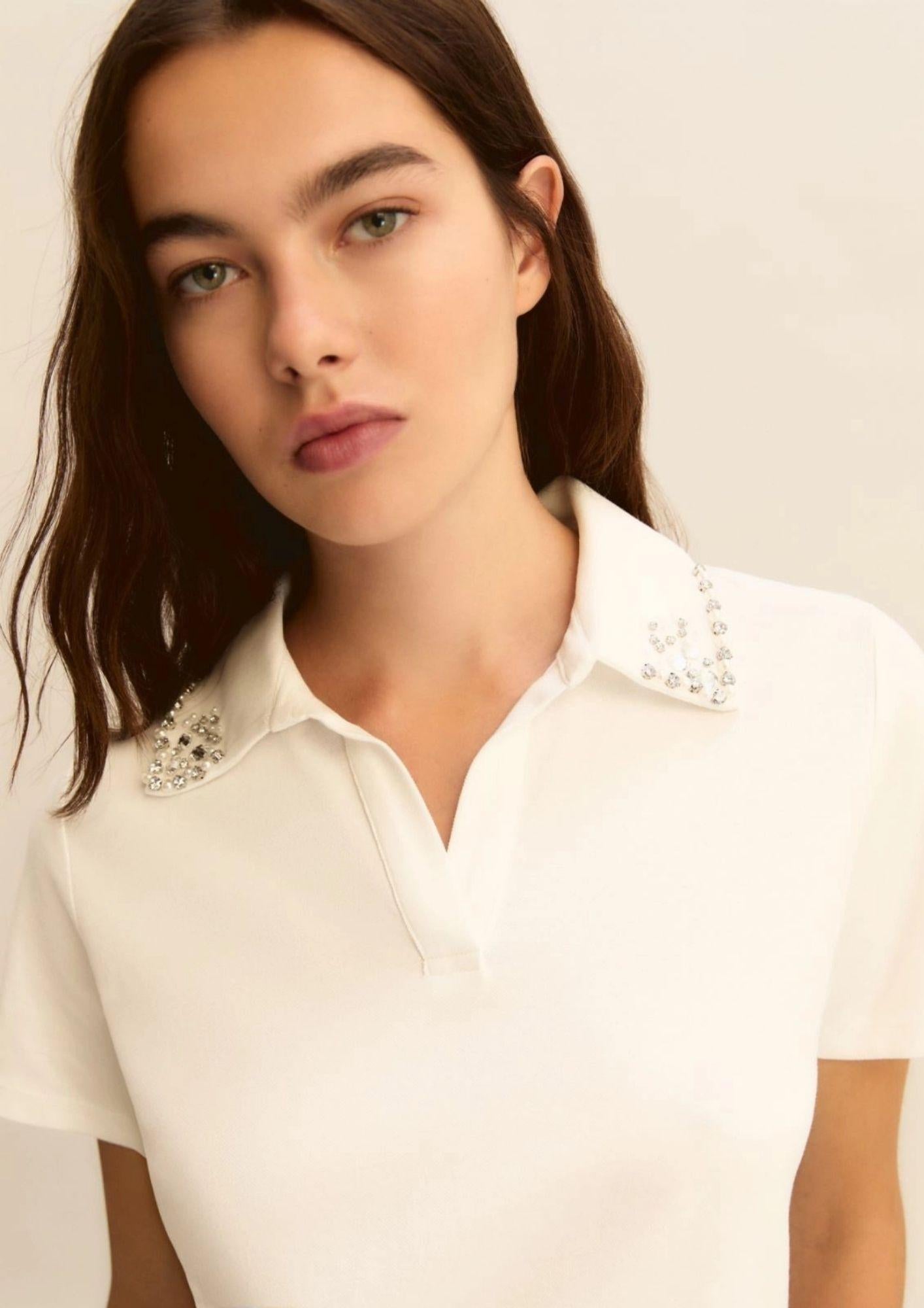 Casual nella costruzione, glamour nei dettagli: nuova polo in cotone stretch, con la classica apertura a V decorata da perle bijoux e cristalli ricamati. Un tocco di luce che rende speciale i tuoi look. Polo in piquet di cotone stretch, Fit regolare Collo a polo con apertura a V Perle bijoux e cristalli applicati sul collo.Tessuto a maglia 95% Cotone, 5% Elastan - Decorazioni escluse Filo decorativo: 100% Poliestere