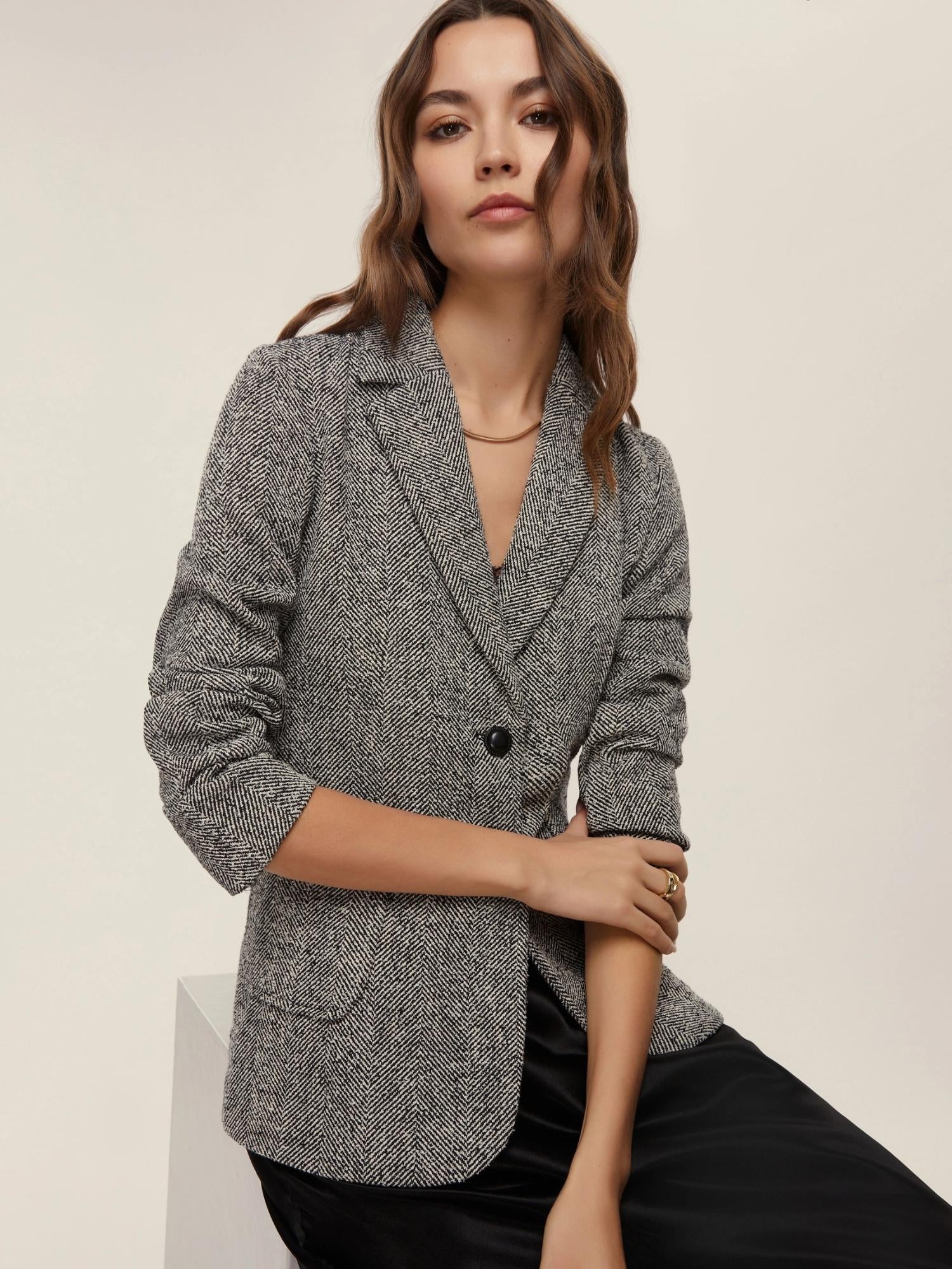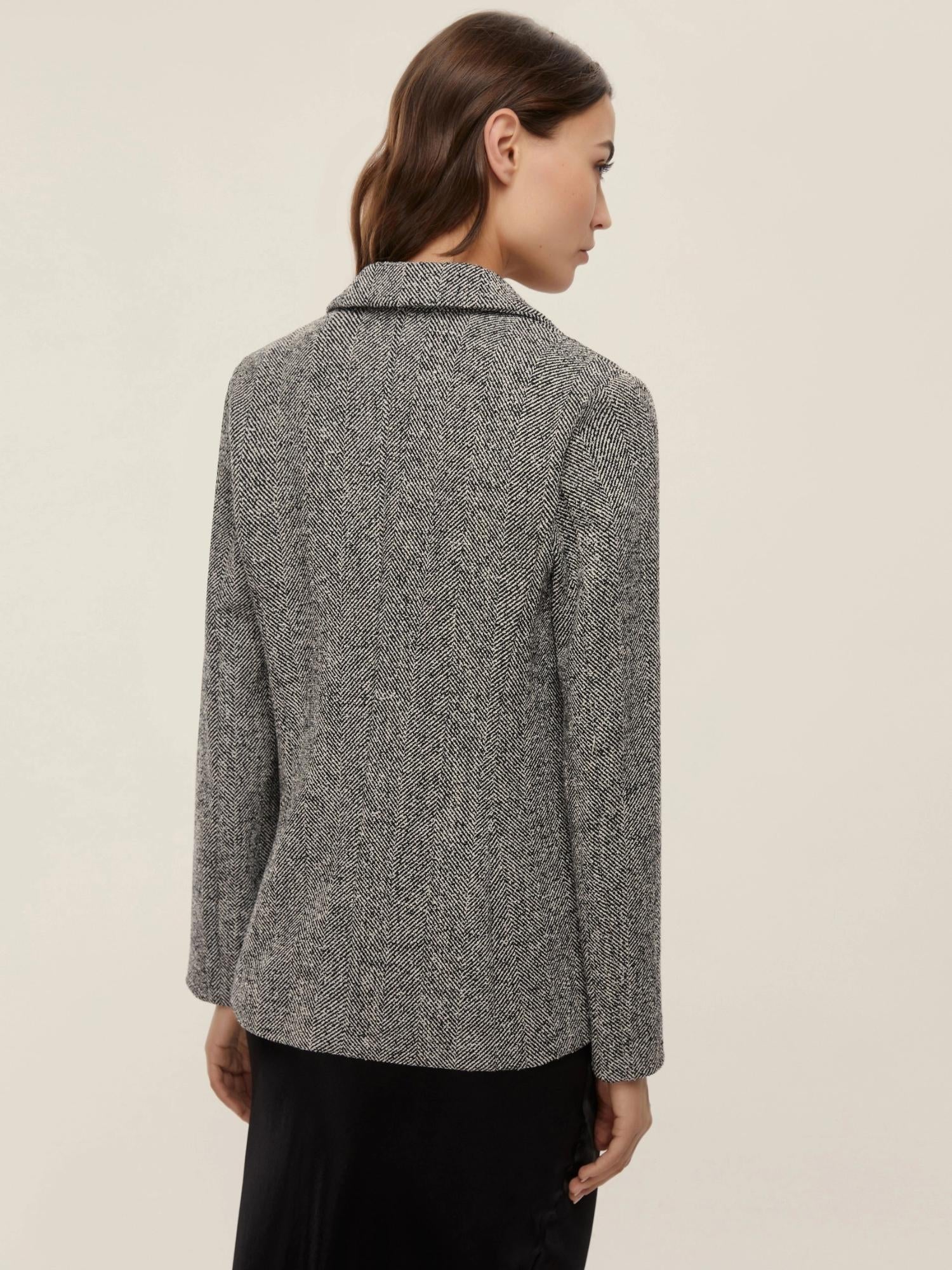 Giacca in stuoia con disegno resca in misto cotone stretch, dal fascino british e dal taglio femminile che valorizza il punto vita con eleganza. Il fit leggermente sfiancato e lo scollo con rever definiscono una silhouette raffinata, mentre le tasche applicate con impunture a vista aggiungono un tocco informale e contemporaneo. La chiusura con due bottoni a vista completa un design curato e versatile, ideale da indossare anche su un top effetto lingerie per un contrasto moderno e sensuale. Tessuto: 56% poliestere, 22% cotone, 21% viscosa, 1% elastan.