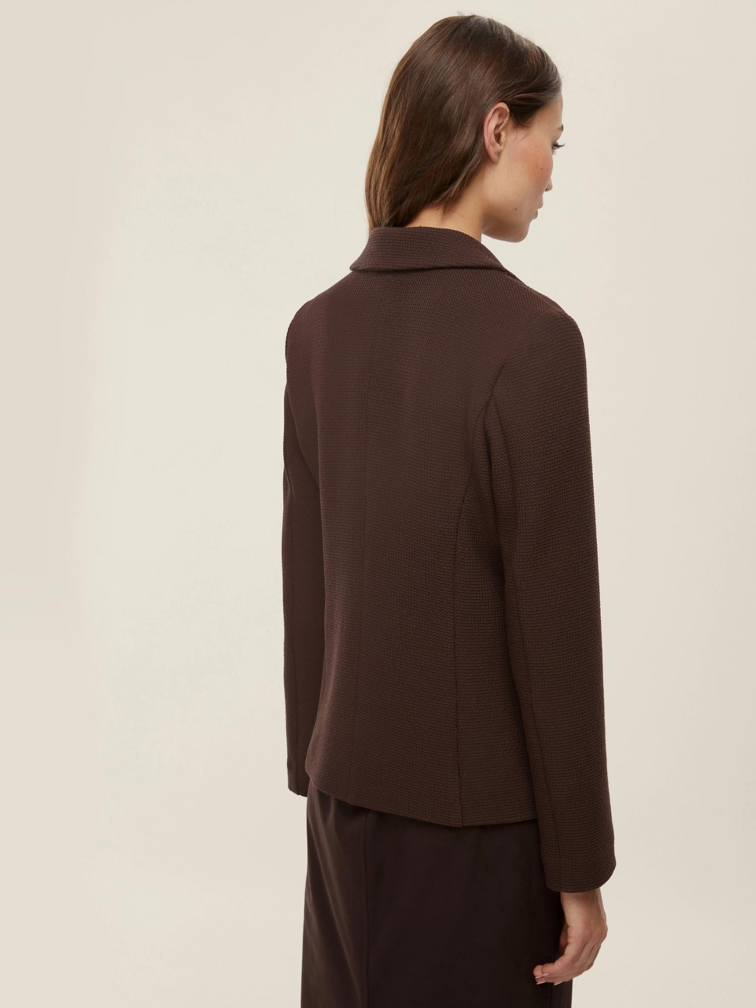 Giacca formale in stuoia armaturata di misto viscosa stretch, caratterizzata da un fit femminile che valorizza la silhouette grazie alla linea leggermente sfiancata e al punto vita definito. Lo scollo con rever e la chiusura a due bottoni a vista conferiscono eleganza e raffinatezza, mentre le tasche applicate con impunture a vista aggiungono un tocco sartoriale. Perfetta da abbinare a una camicia e una gonna longuette per un look urbano sofisticato e senza tempo. Tessuto: 72% poliestere, 27% viscosa, 1% elastan.