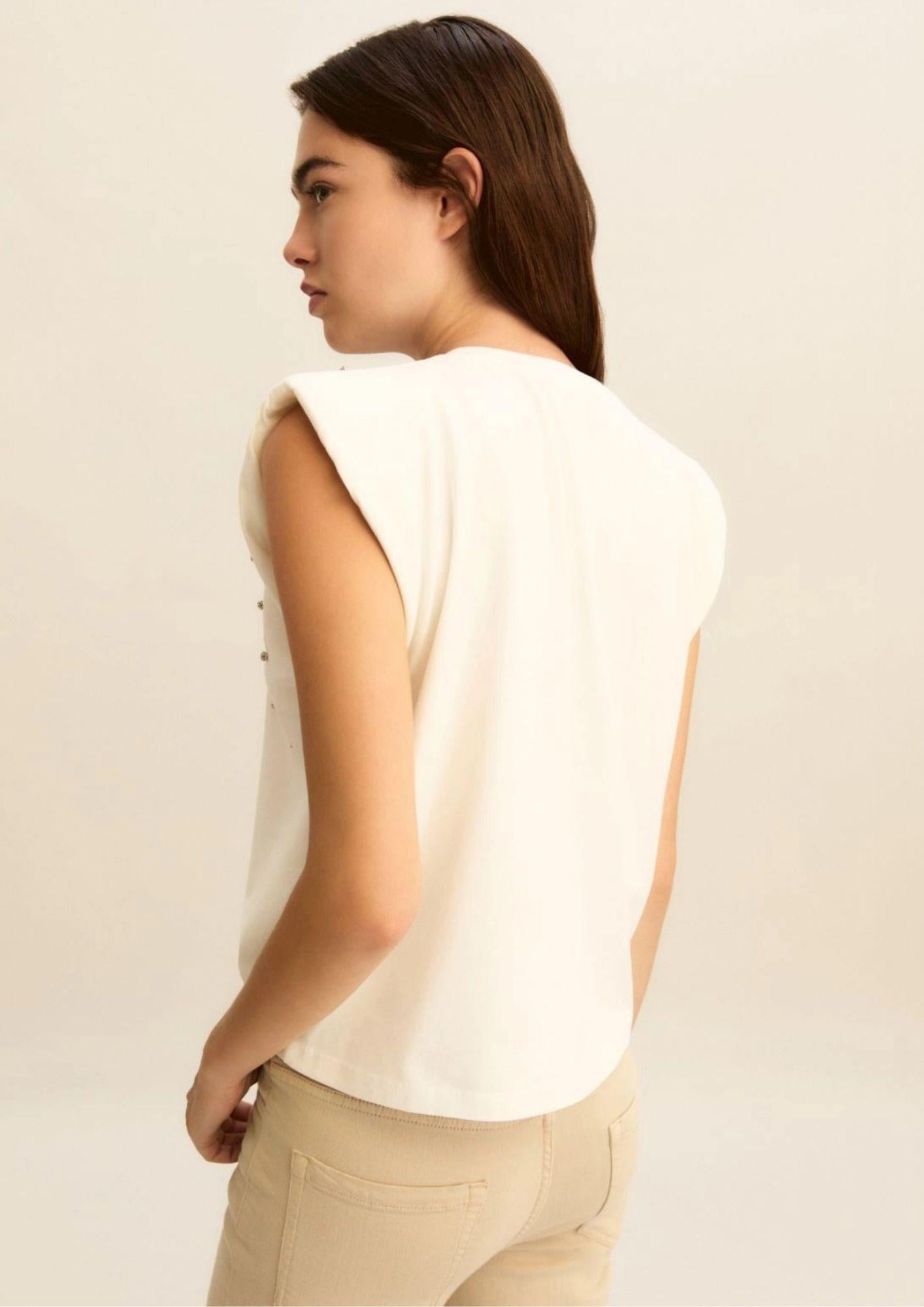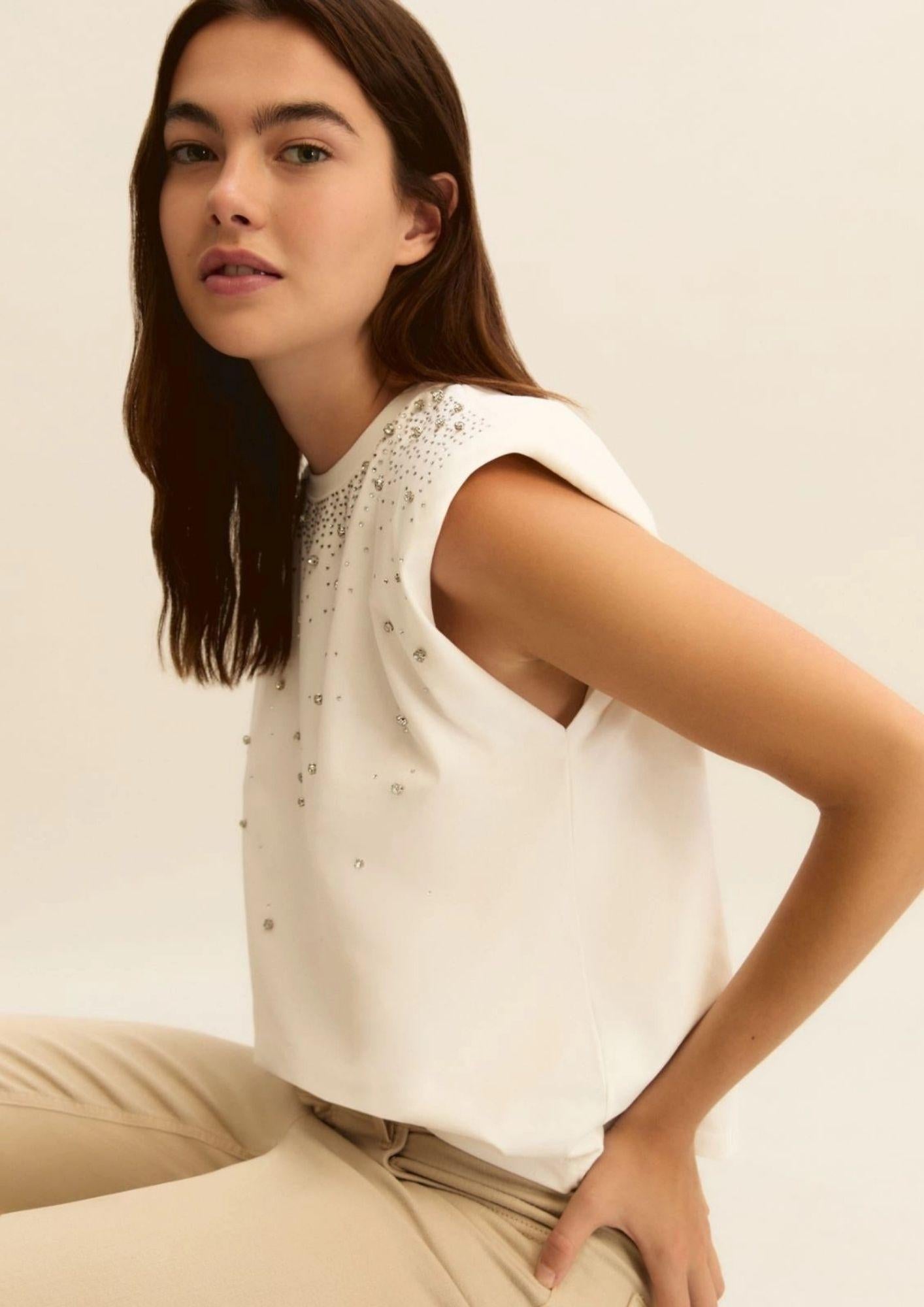 Modello smanicato con spalline imbottite Cristalli degradanti e di due dimensioni applicati sul davanti. Tessuto a maglia 97% Cotone, 3% Elastan Filo decorativo 100% Poliestere Decorazioni escluse.