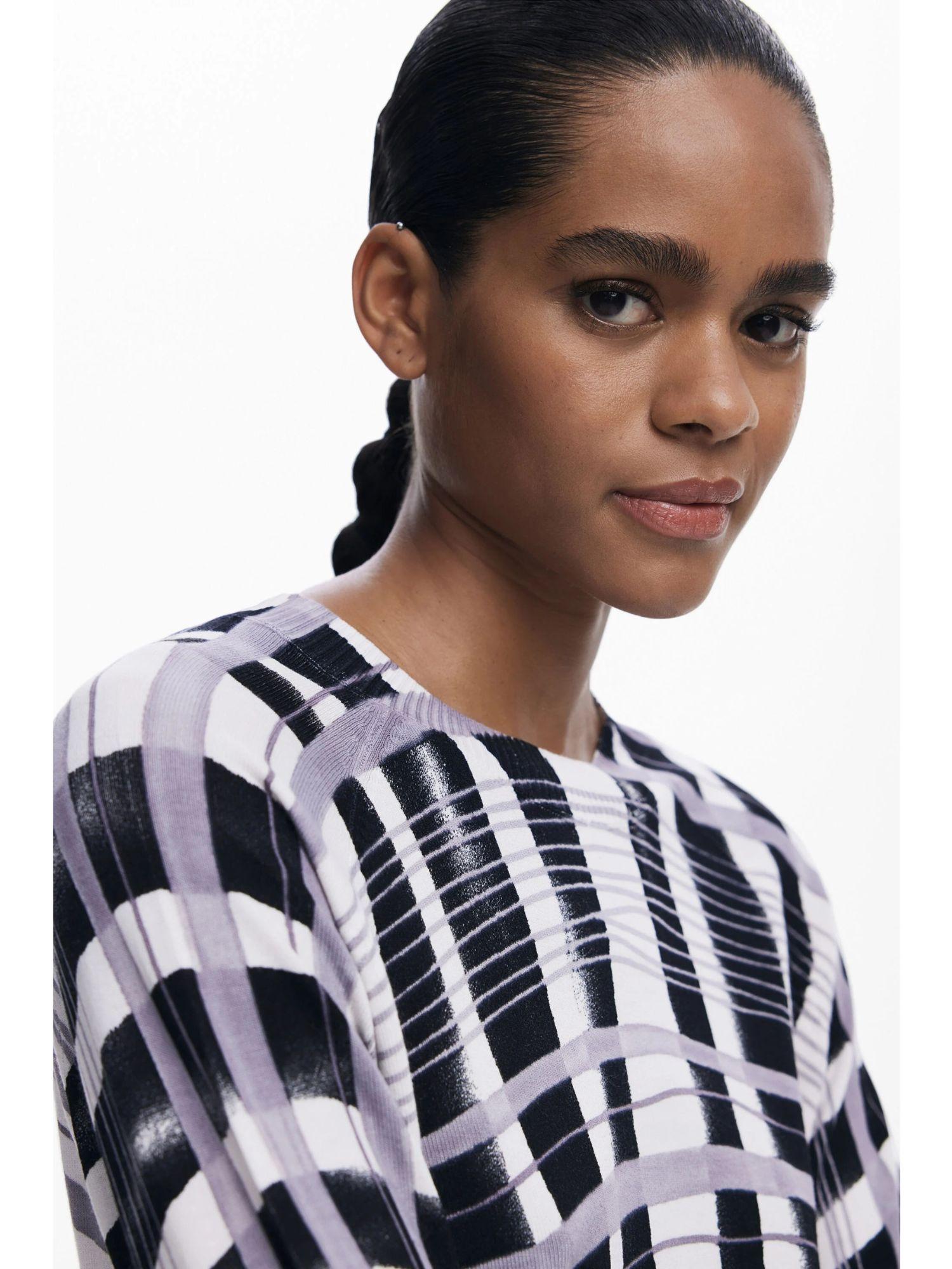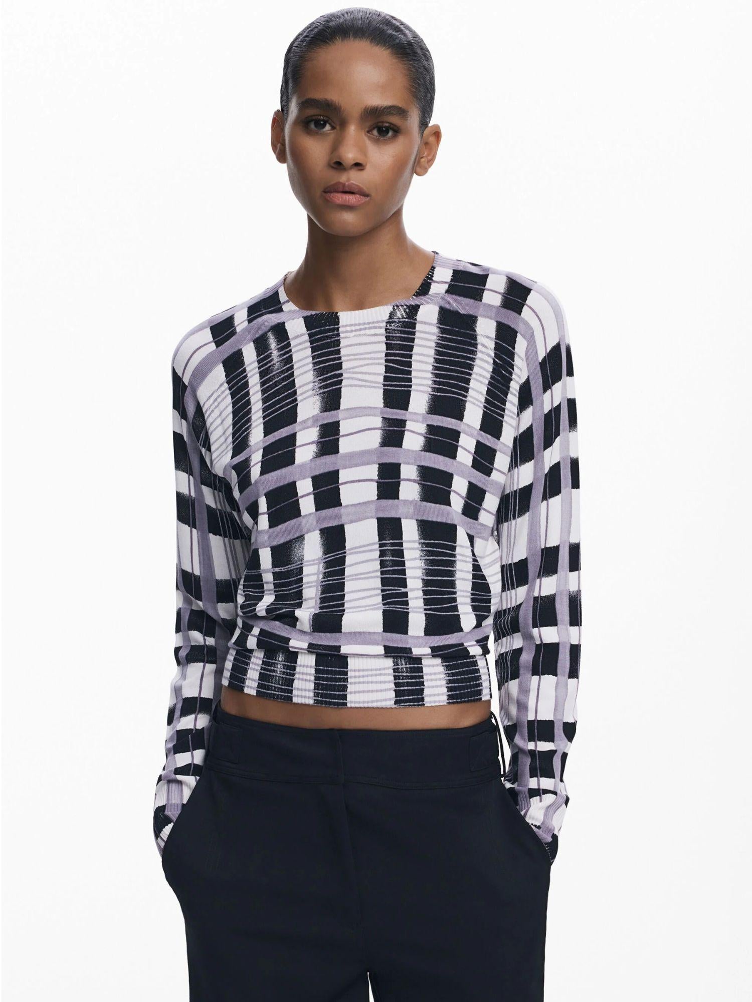 Maglione leggero a maniche lunghe con collo rotondo e stampa a righe stile mikado in versione orizzontale e verticale. Stampa a righe. Fit regular. Collo rotondo. Manica lunga. Tessuto leggero. Collezione AW25. Progettato a Barcellona. Misure modello: altezza 178 cm, vita 59 cm, fianchi 86 cm. Taglia modello: S. Composizione esterna: 80% viscosa, 20% poliammide.