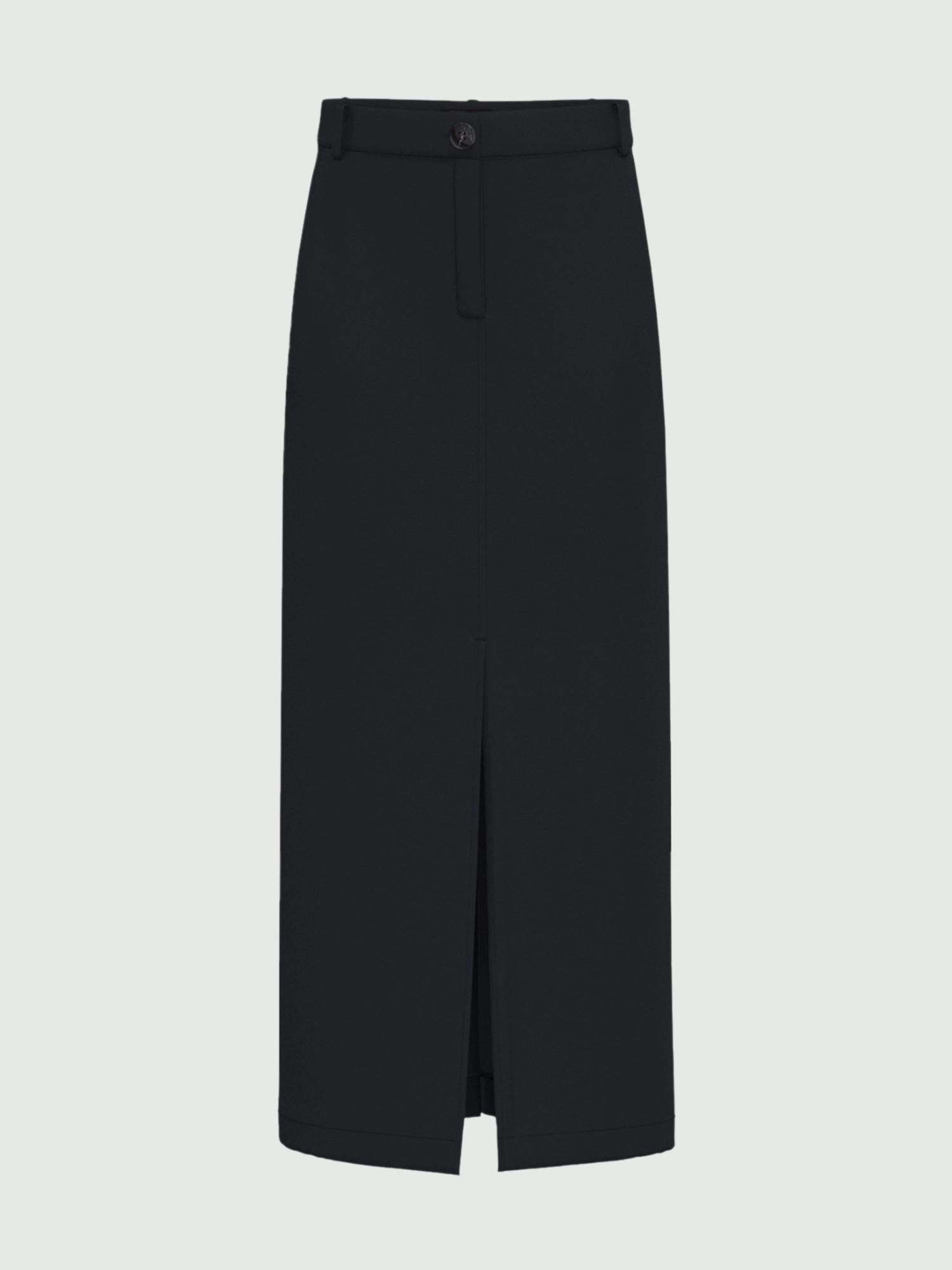 Dritta per slanciare la silhouette, la gonna a tubino si apre al centro in uno spacco sensuale, mentre la chiusura a chino aggiunge una nota casual. Da indossare con una maglia vaporosa o con le frange cool. Gonna in twill tecnico bistretch. Fit a tubino. Cintura in vita con passanti. Chiusura con bottone e zip. Tasche laterali alla francese. Spacco sulla metà sia davanti che sul retro. Composizione e lavaggio: In lavatrice max 30 gradi ridotta azione meccanica; non candeggiare; non asciugare in tamburo; asciugare appeso in ombra; ferro tiepido max 120 gradi c; lavare a secco delicato con percloroetilene. 95% poliestere, 5% elastan.