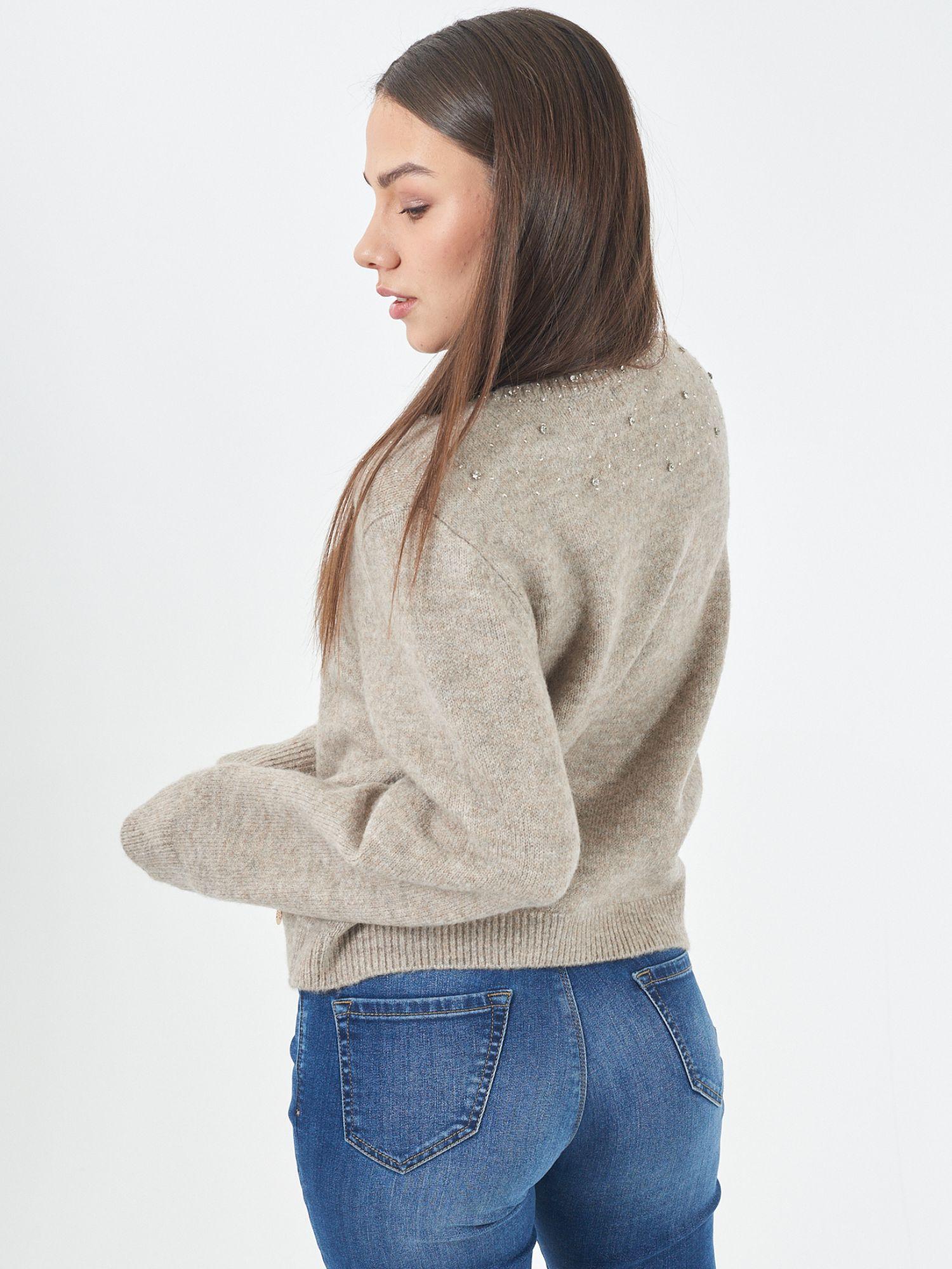 Maglia a girocollo con applicazioni, girovita polsini e collo a costine, 67% Acrilico 30% Poliestere 3% Elastane
