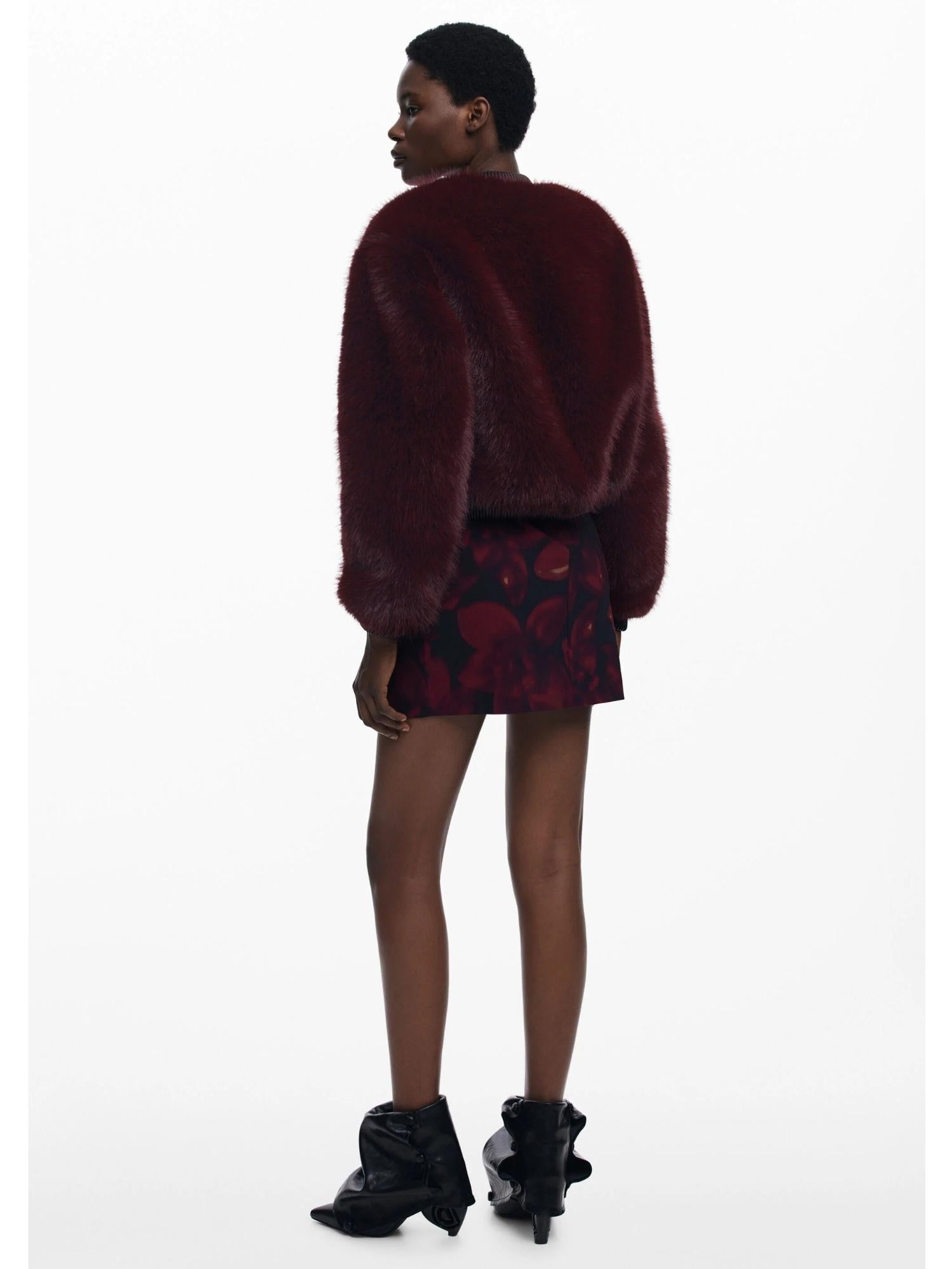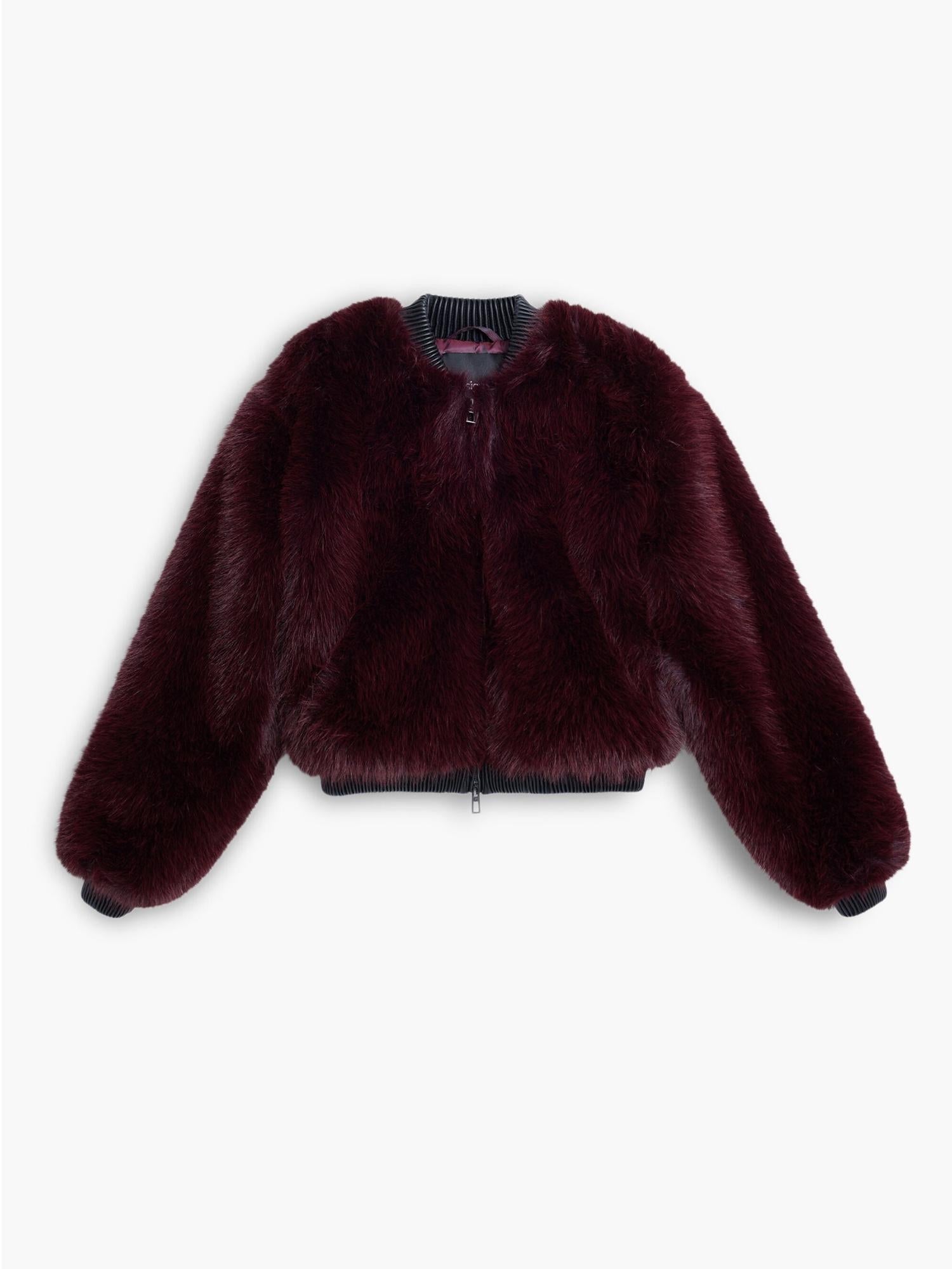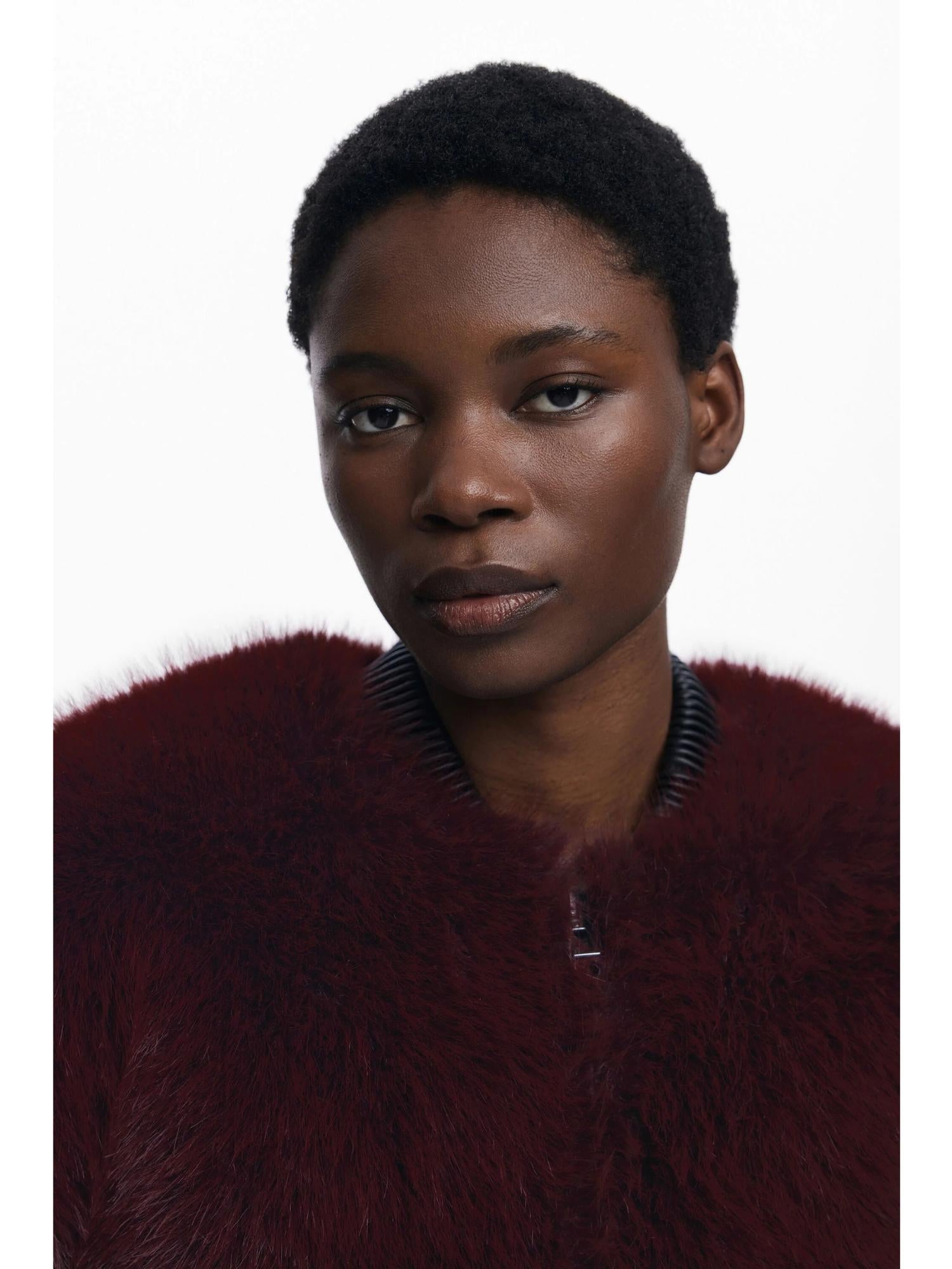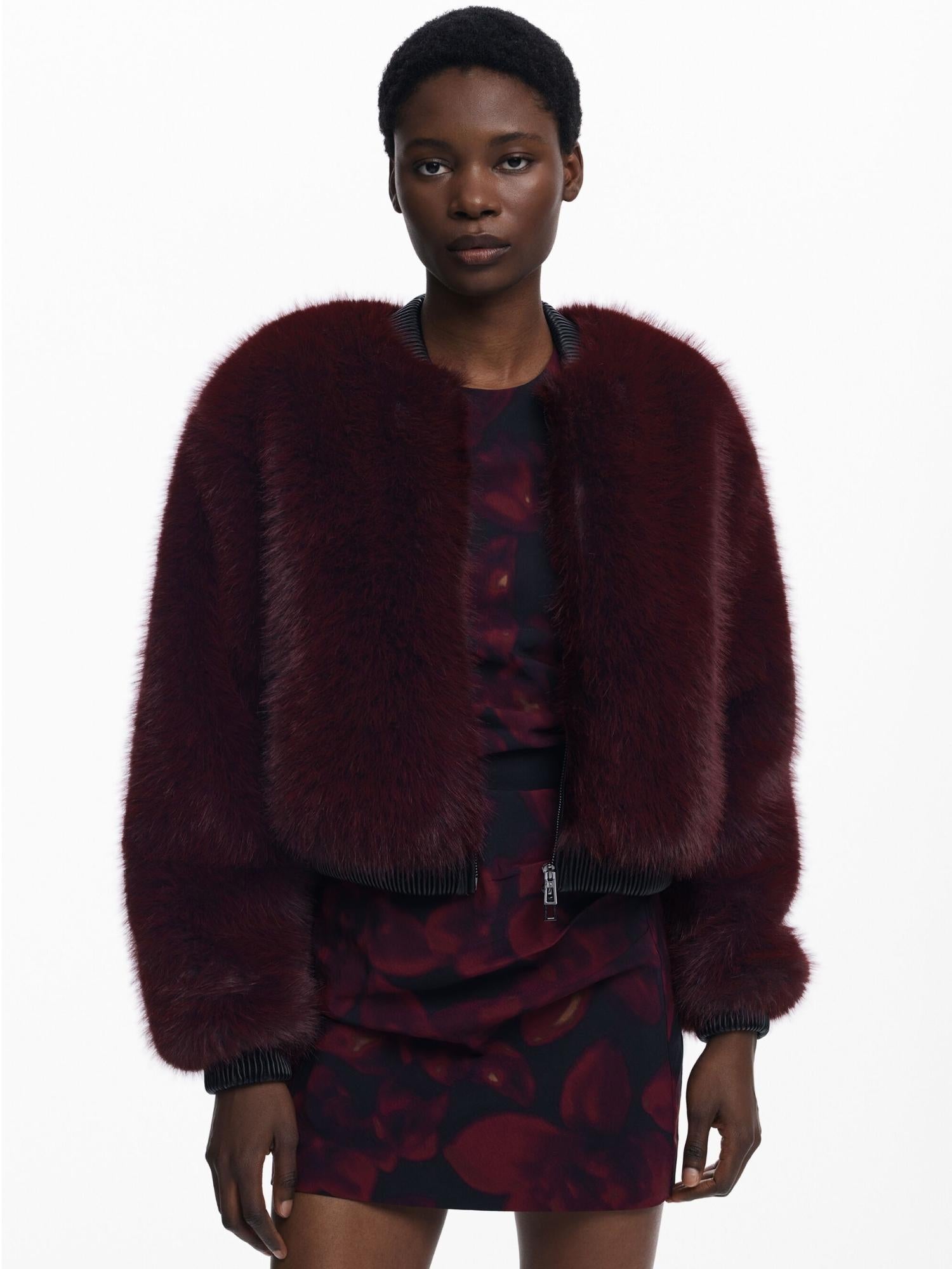 Giacca corta in pelliccia sintetica stile bomber con collo in maglia e chiusura a cerniera color lampone. Colore: tinta unita. Fit regular. Collo rotondo. Manica lunga. Chiusura con cerniera. Collo a maglia. Pelliccia sintetica. Collezione AW25. Progettato a Barcellona. Poliestere riciclato. Misure modello: altezza 180 cm, vita 61 cm, fianchi 89 cm. Taglia modello: M. Composizione esterna: 100% poliestere. Composizione interna: 52% poliestere, 48% viscosa.