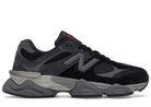 this black new balance 9060 sneaker consists of a black mesh base with monochromatic pigskin suede and leather overlays. the shoe is designed with "n" branding on the side panel, a plush tongue, and flat laces. the model has a cr device at the heel. the design is completed by a chunky, dual-density midsole equipped with abzorb and sbs cushioning.