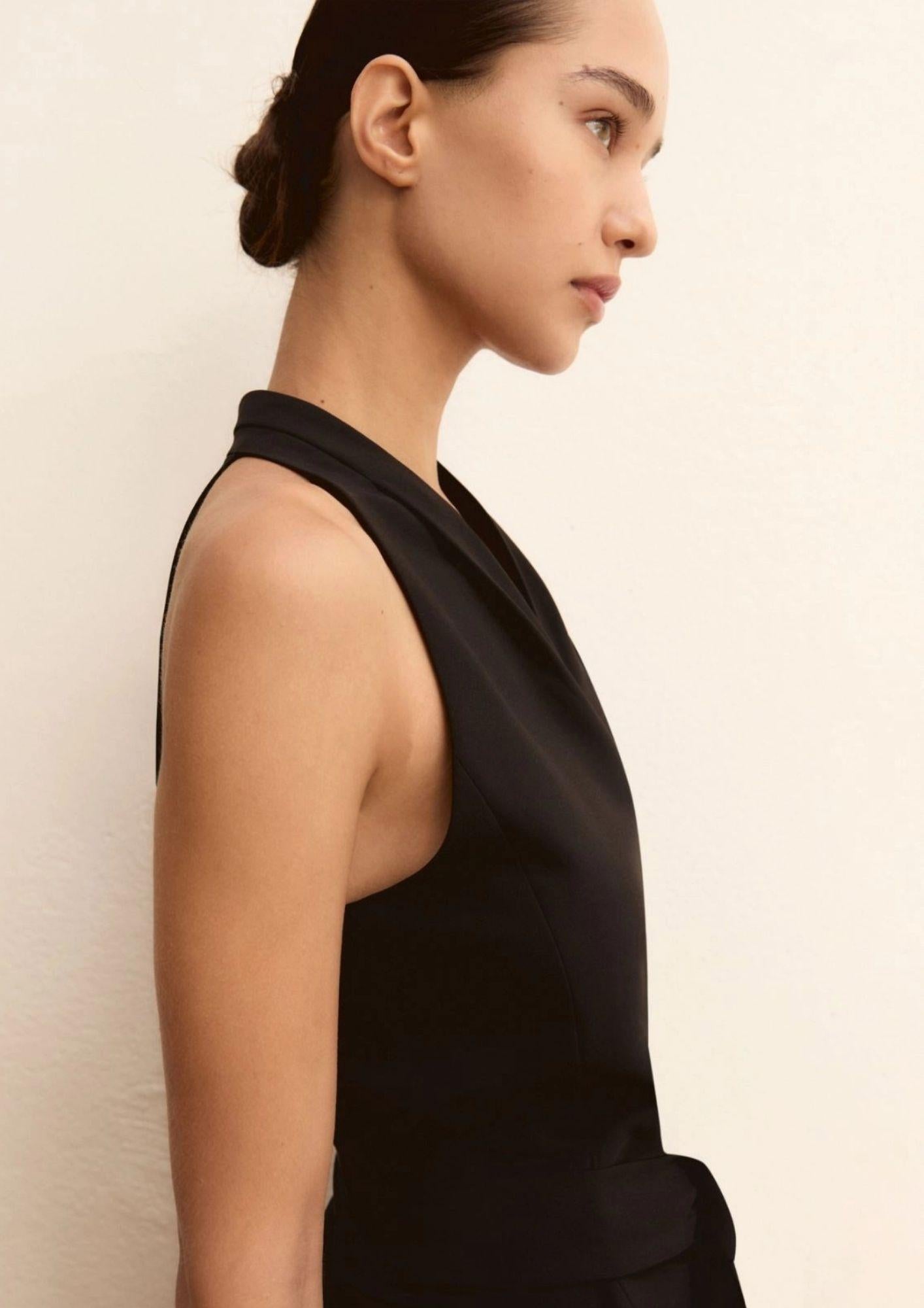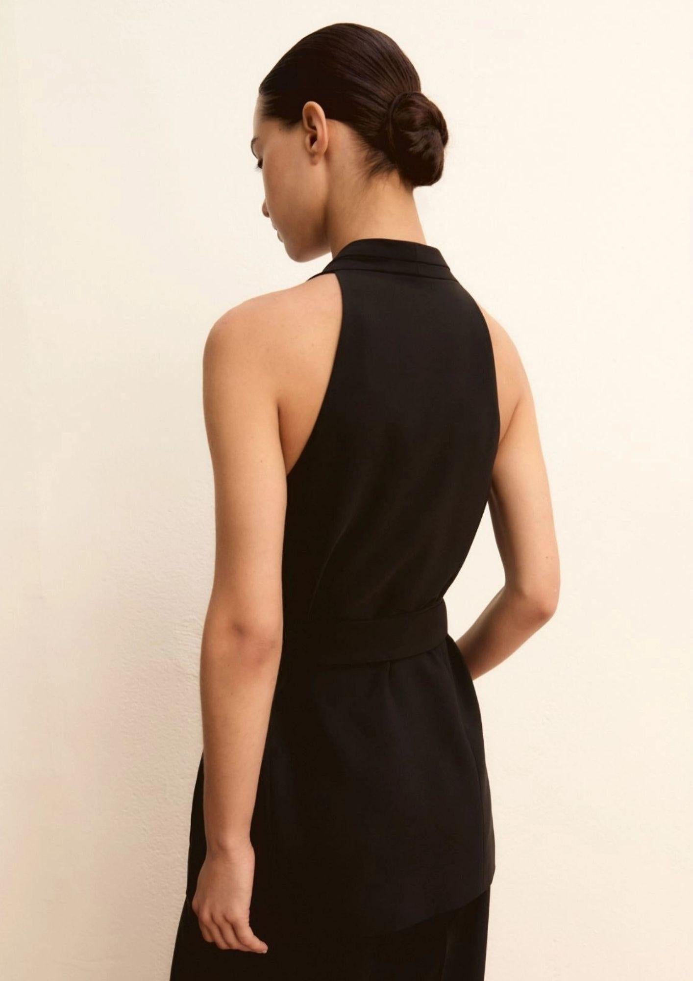 Completo casacca e pantalone in fluido poliestere bistretch. Gilet linea semi aderente, scollo a V con motivo piega sullo scollo, allacciatura davanti incrociata con cintura da annodare, motivo tagli davanti che si aprano a spacchi. Capo foderato lungo cm72. Pantalone fit larghi con motivo pinces davanti, allacciatura con gancio a uomo e lampo per fessa, tasche alla francese, passanti su cintone davanti e dietro. Pantalone lungo cm106.