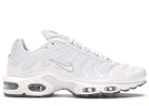 the nike air max plus white is a versatile shoe, ideal for everyday use and an active lifestyle. there is air cushioning on the heels and forefront, allowing for full-length cushion and support. the ankles are also well-supported. the wavy design lines are complemented with the plastic accents and breathable mesh on the upper of the shoe. the shoe also features colored air pods to provide a touch of contrast, and the all-white color of the nike air plus white gives it a clean look.