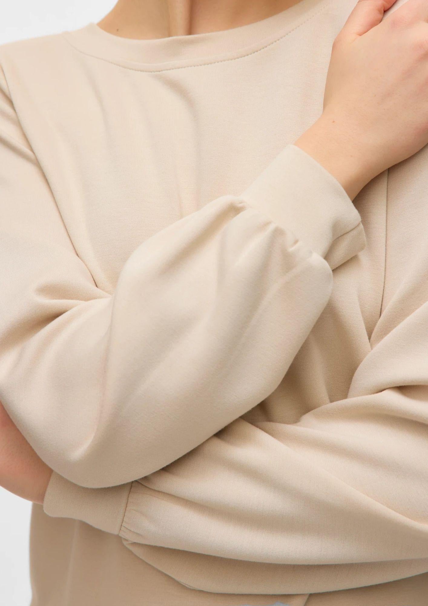 Felpa dal design comodo e moderno, un capo essenziale che unisce comfort e stile in ogni occasione. Realizzata in morbida viscosa LENZING ECOVERO, poliestere riciclato ed elastan, offre una vestibilità regular fit che garantisce libertà di movimento e una sensazione avvolgente. Il modello presenta scollo a barca e maniche lunghe voluminose per un look casual ma curato. Perfetta da abbinare a jeans o pantaloni in felpa per uno stile rilassato e contemporaneo. Composizione 50% viscosa LENZING ECOVERO, 45% poliestere riciclato, 5% elastan.